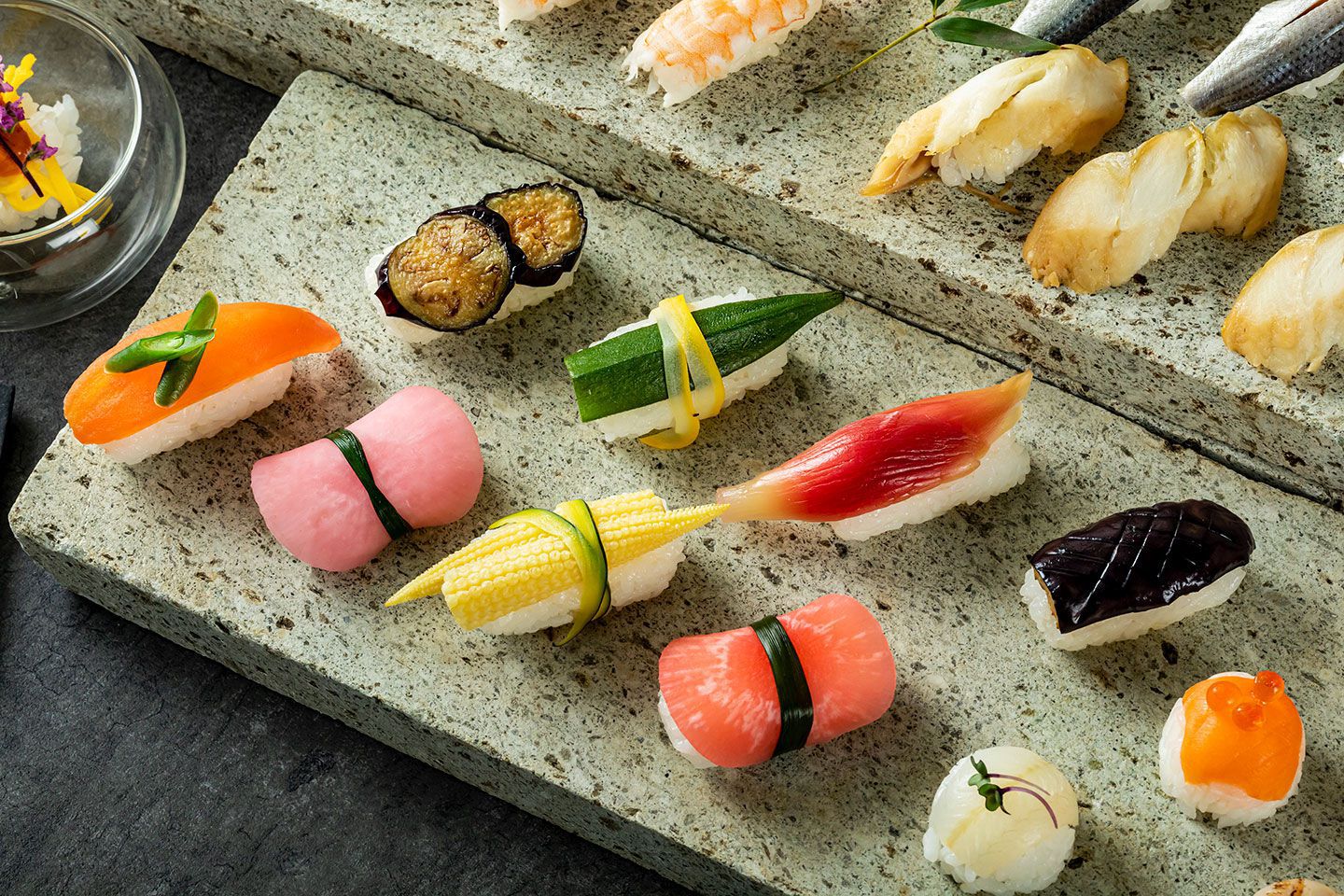 - 【野菜寿司】トマト、紅心大根、オクラ、みょうが、ホウレンソウ、赤カブ、茄子、ヤングコーン