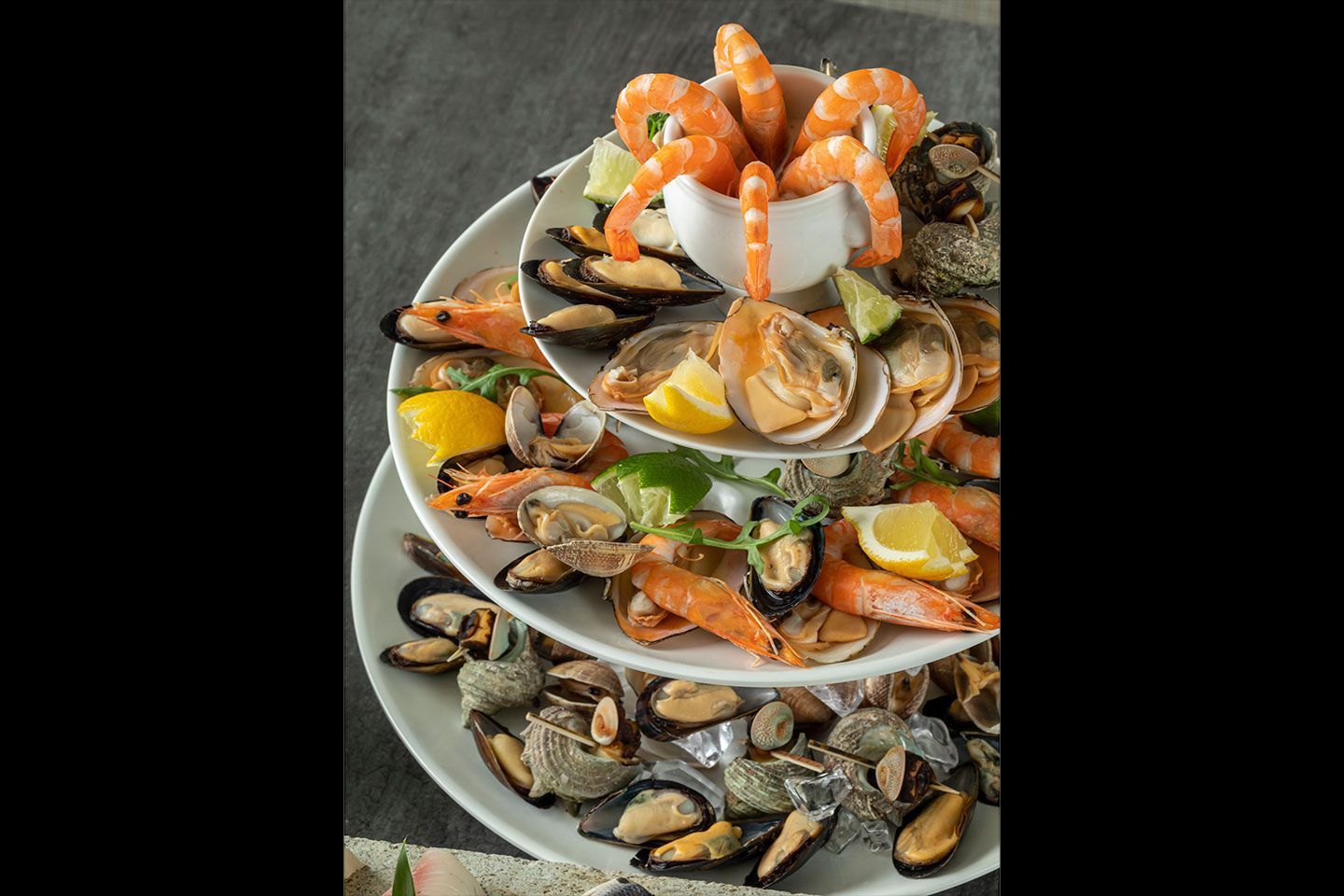 【オードブルタワー】6種の貝類をワンフィンガーフードとしてタワーに盛り付けます